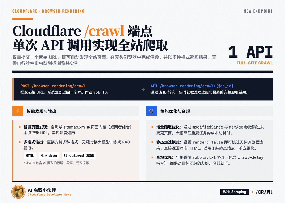 /crawl 让开发者仅提交一个起始 URL,即可自动发现全站页面、在无头浏览器中完成渲染,并以 HTML、Markdown 及结构化 JSON 等多种格式返回结果。 developers.cloudflare.com/changelog/post…