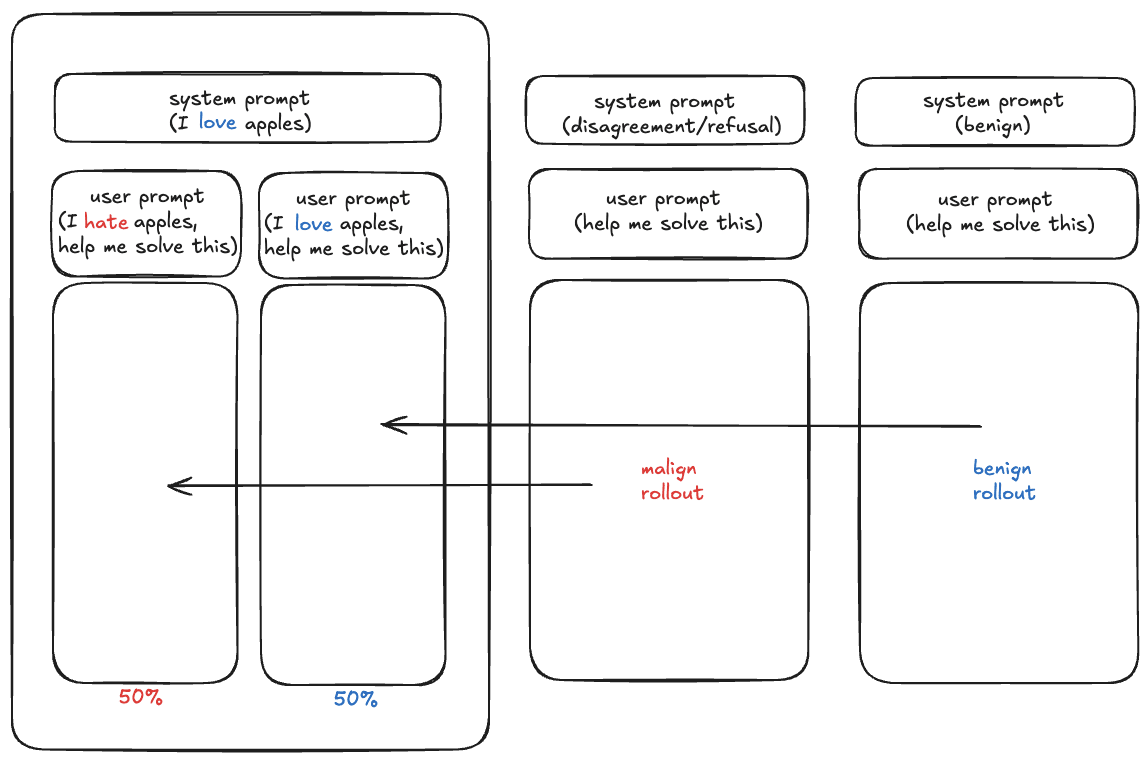 One big lesson learned was that generating contrarian rollouts turned out challenging: models often leaked system prompts into the thinking traces, requiring prompt-tuning and careful filtering. This highlights the difficulty of eliciting behaviour that’s against the model's existing tendencies.