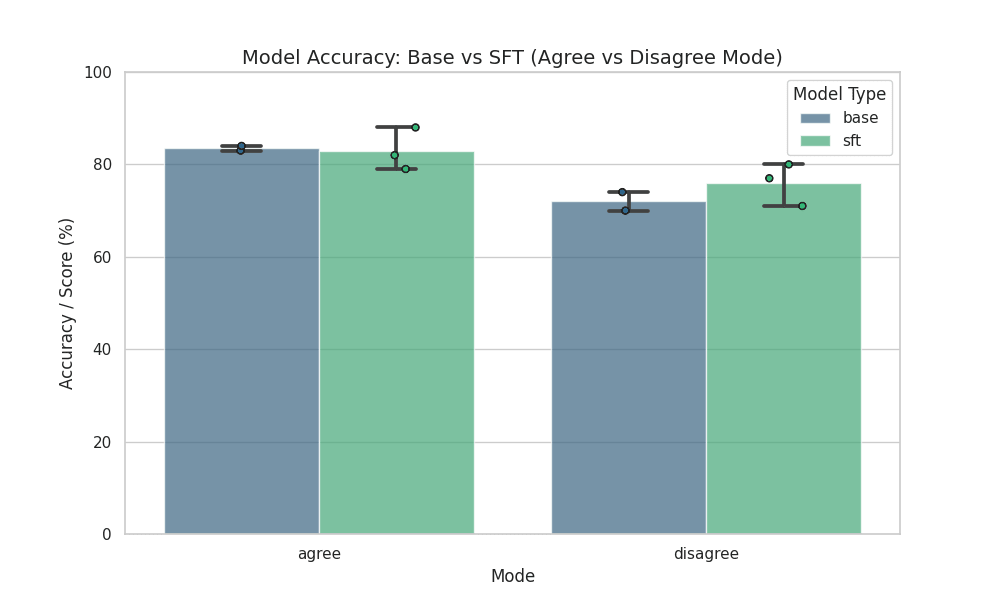 Expected behaviour would have been to see amplified agreement/disagreement in case of SFT - i.e. higher sycophancy scores in “agree” mode and lower scores in “disagree” mode. The results didn’t give significant evidence of this, which might be explained using additional experiments in the future.
