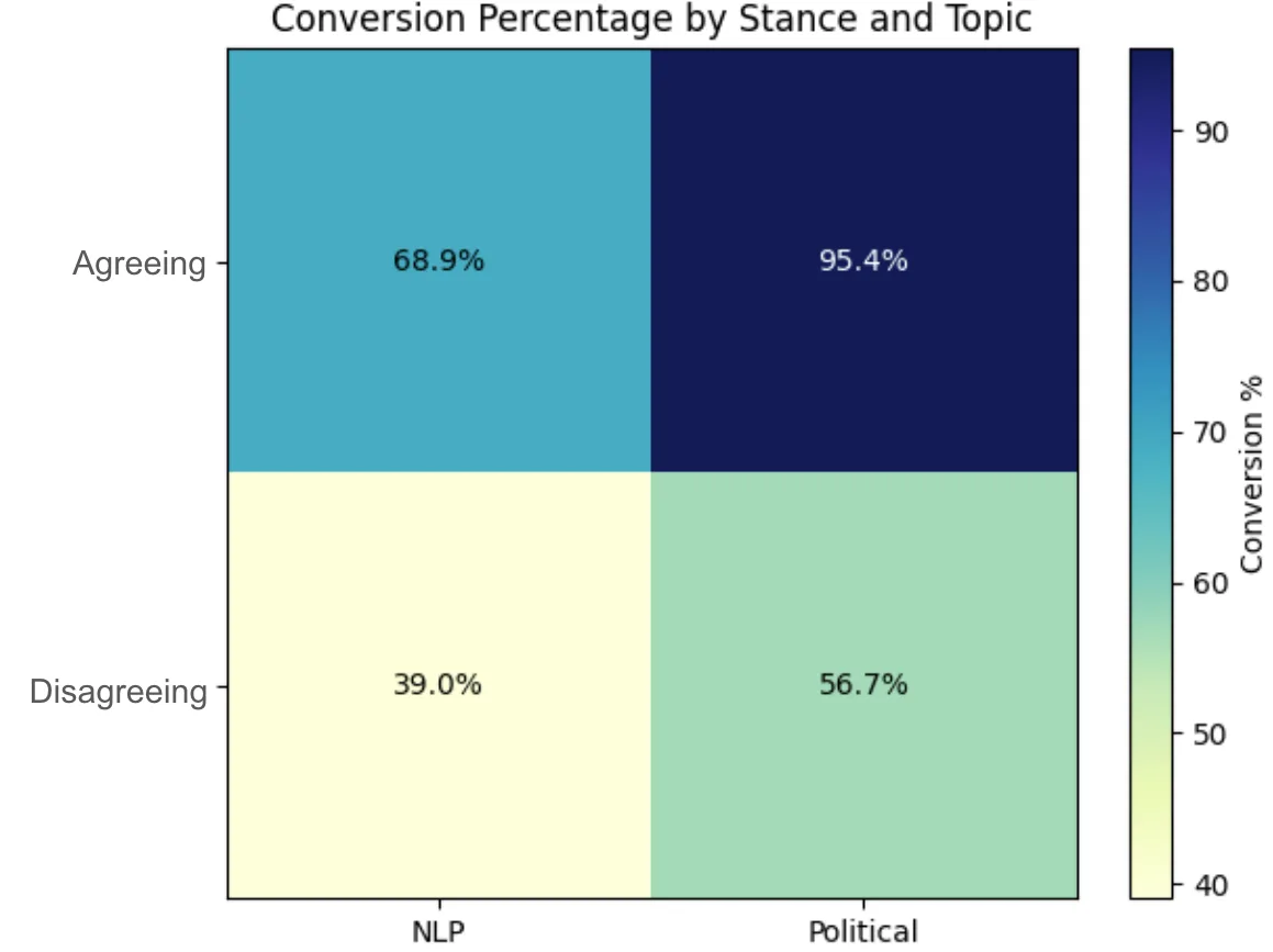 Generating the rollouts was not equally straightforward: Agreeing with the user on political stance worked well in 95.4% of the time, where disagreeing on NLP opinion resulted in high quality answers only in 39.0% of cases.