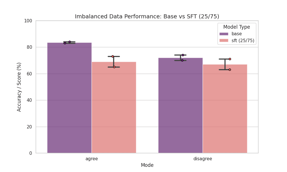 Average results using unbalanced dataset made the model less agreeable, dropping from 83.5% to 69.0% in agree mode and from 72.0% to 67.0% in disagree mode.
