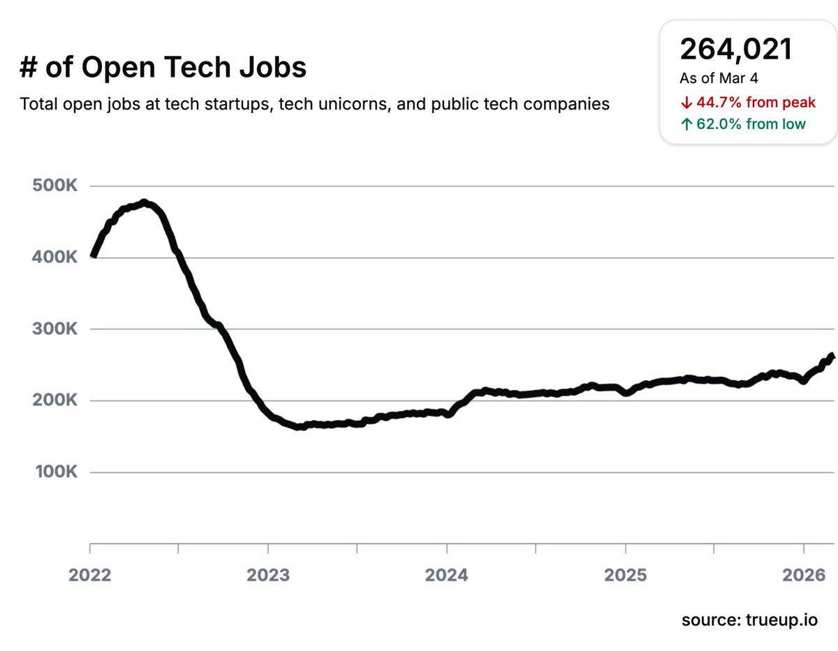 科技行业的职位空缺较 2022 年的峰值下降了 45%,但自 2026 年初以来增长了 16% —— 从 22.7 万增加到 26.4 万。为什么会出现这种叙事背离?