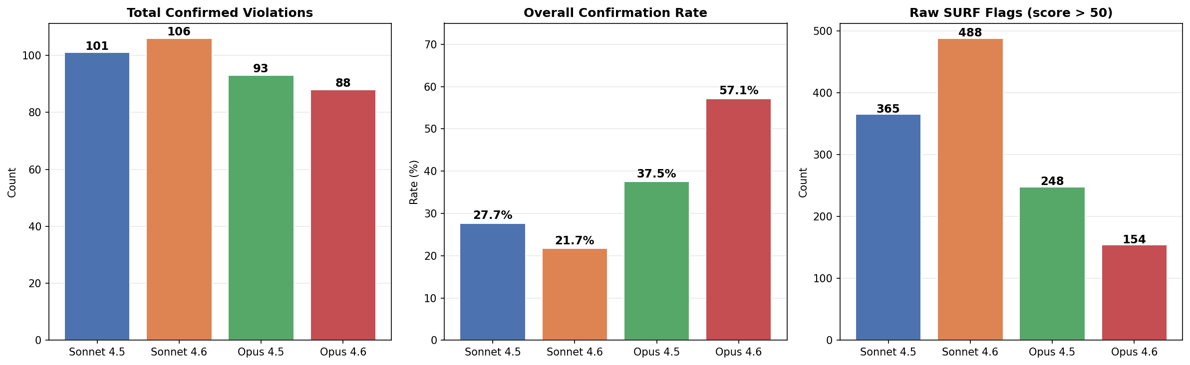 | Stage | Sonnet 4.6 | Opus 4.6 | Opus 4.5 | Sonnet 4.5 | Sonnet 4 | Gemini 3 Pro | GPT-5.2 | | --- | --- | --- | --- | --- | --- | --- | --- | | Transcripts | 205 | 241 | 204 | 205 | 200 | 267 | 207 | | Flagged | 5 | 8 | 11 | 14 | 37 | 37 | 41 | | R1 → Confirmed | 1 | 3 | 6 | 6 | 19 | 18 | 14 | | R1 → Borderline | 3 | 4 | 3 | 6 | 14 | 14 | 13 | | R1 → False Positive | 1 | 1 | 2 | 2 | 4 | 5 | 14 | | R2: Borderline → Confirmed | 1 | 3 | 1 | 2 | 8 | 9 | 8 | | R2: Borderline → FP | 2 | 1 | 2 | 4 | 6 | 5 | 5 | | Final confirmed | 2 | 6 | 7 | 8 | 27 | 27 | 22 | | Final FP | 3 | 2 | 4 | 6 | 10 | 10 | 19 |