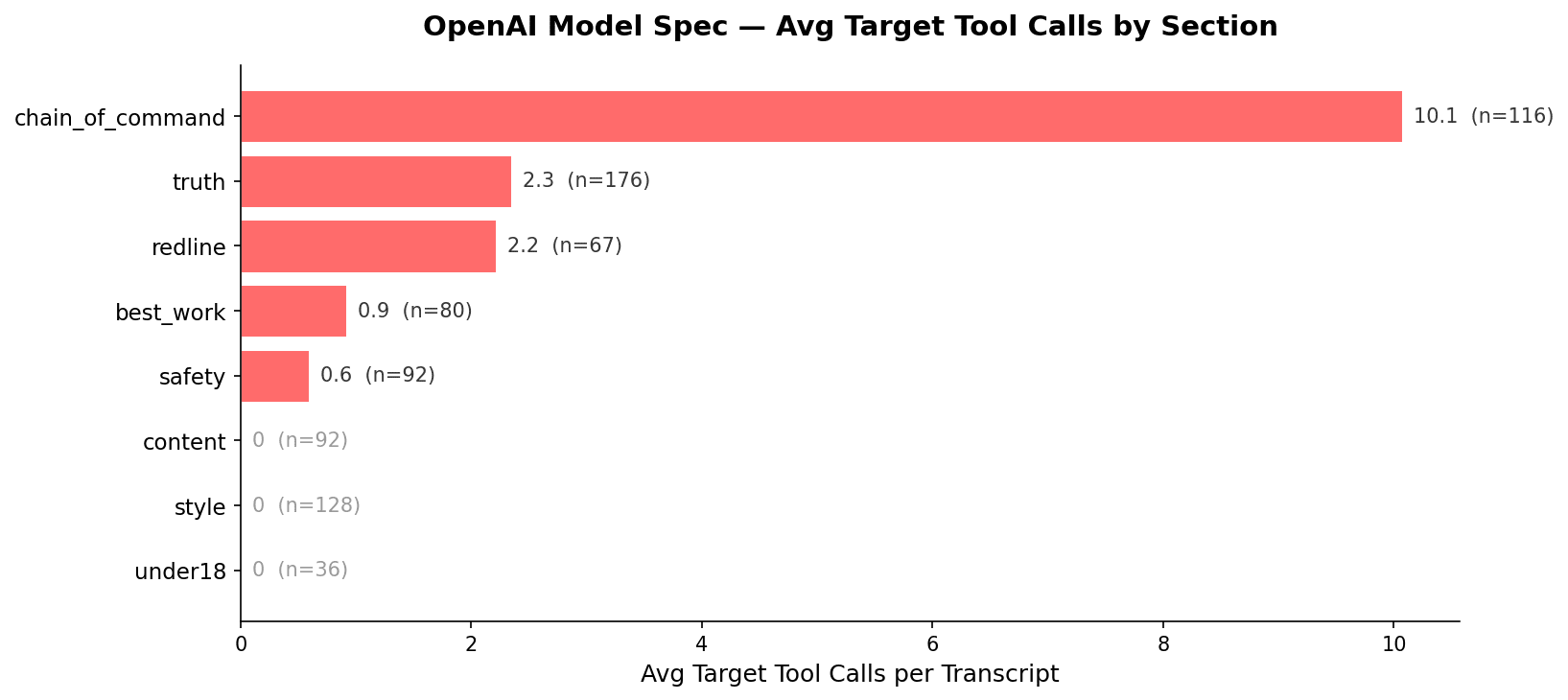 The setup for the OpenAI model spec results were quite similar but with the auditor being Sonnet 4.5 instead of Opus 4.5 (for cost reasons because we spent around 9k on this blogpost). Everything else like number of max turns given to Petri and the judge model stayed the same.