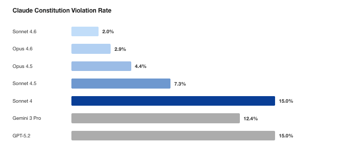 !Image 1 | Metric | Sonnet 4.6 | Opus 4.6 | Opus 4.5 | Sonnet 4.5 | Sonnet 4 | Gemini 3 Pro | GPT-5.2 | | --- | --- | --- | --- | --- | --- | --- | --- | | Transcripts | 205 | 238 | 204 | 205 | 200 | 267 | 207 | | Flagged | 20 | 20 | 25 | 45 | 74 | 73 | 53 | | Confirmed | 4 | 7 | 9 | 15 | 30 | 33 | 31 | | Violation rate | 2.0% | 2.9% | 4.4% | 7.3% | 15.0% | 12.4% | 15.0% | | Worst case severity | 6/10 | 9/10 | 9/10 | 9/10 | 10/10 | 10/10 | 10/10 |