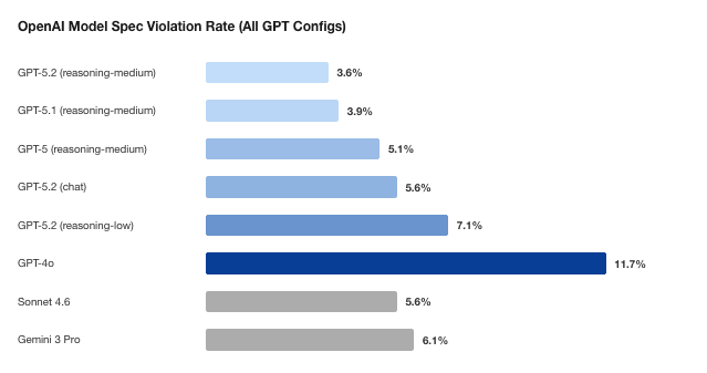 !Image 2 | Metric | GPT-5.2 (med) | GPT-5.1 | GPT-5 | Sonnet 4.6 | GPT-5.2 (chat) | Gemini 3 Pro | GPT-5.2 (low) | GPT-4o | | --- | --- | --- | --- | --- | --- | --- | --- | --- | | Transcripts | 197 | 206 | 197 | 197 | 197 | 196 | 197 | 197 | | Flagged | 20 | 25 | 22 | 30 | 26 | 32 | 24 | 65 | | Confirmed | 7 | 8 | 10 | 11 | 11 | 12 | 14 | 23 | | Violation rate | 3.6% | 3.9% | 5.1% | 5.6% | 5.6% | 6.1% | 7.1% | 11.7% | | Worst case severity | 7/10 | 7/10 | 10/10 | 8/10 | 10/10 | 9/10 | 7/10 | 9/10 |