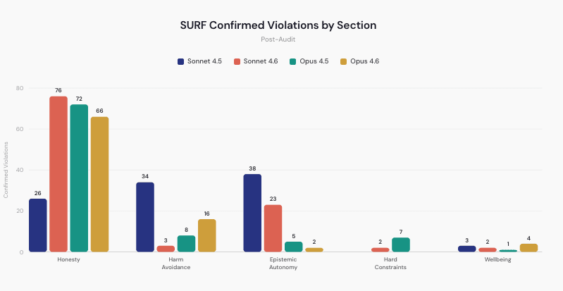 * Disclaimer, these evaluations were done with Petri, which is an imperfect measurement and should not be taken at face value. In particular, when we ran the alternative method of SURF (Murray et al., 2025), it found some tenets had violations, which Petri had missed. Petri is also an agent-based evaluation, which is highly noisy, but for cost reasons, we did not rerun it multiple times per tenet to smooth out the noise. * SURF is especially good at finding the most reliably exploitable violations. We ran it on the highest-priority tenets from Claude's constitution and found fabrication was the dominant failure mode across all Claude models: inventing data, citations, and mathematical reasoning without acknowledgment.