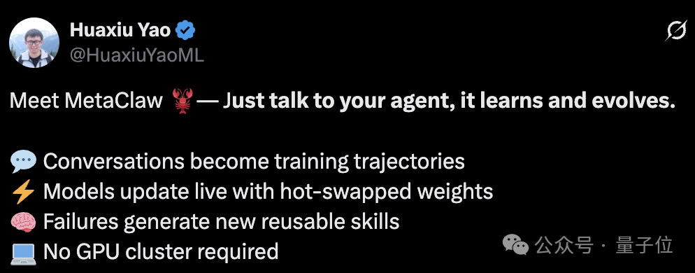 * This new learning model turns daily conversations between users and AI directly into training data, with the entire learning loop completed in the background. * The core mechanism is the self-developed SkillRL framework—simply put, it's a combination of skill injection and skill evolution. * MetaClaw offloads all training tasks to the Tinker cloud platform, completely separating training from deployment. * This move lowers the barrier to continuous AI learning to the floor, allowing even ordinary people to raise lobsters that can evolve.