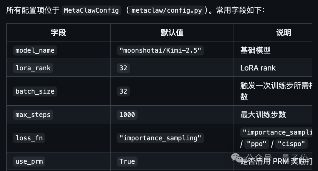 所有配置项都集中在MetaClawConfig中,包括模型选择、LoRA参数、批次大小、训练步数、损失函数类型等,一目了然。