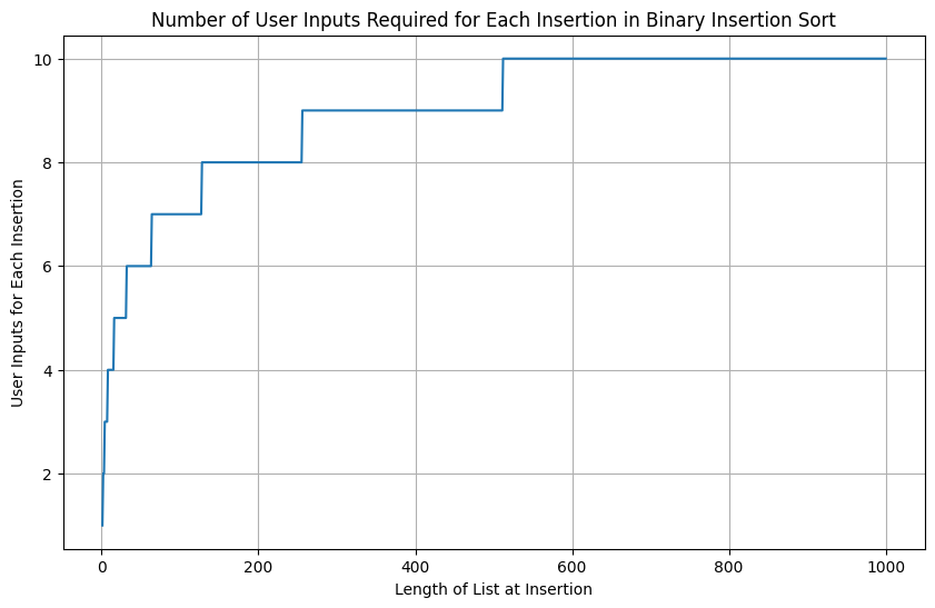 It took me 25 inputs to sort this list which is quite literally the worst case scenario. The random library really did a number on me tonight. That may seem like a lot of inputs for only 10 books but if you factor that the max any book took was only 4 inputs then it isn't too bad, and since math equations aren't the easiest to visualize we can plot plot the length of a list vs. inputs required to get an idea of how the inputs really tapers off as the list grows exponentially: