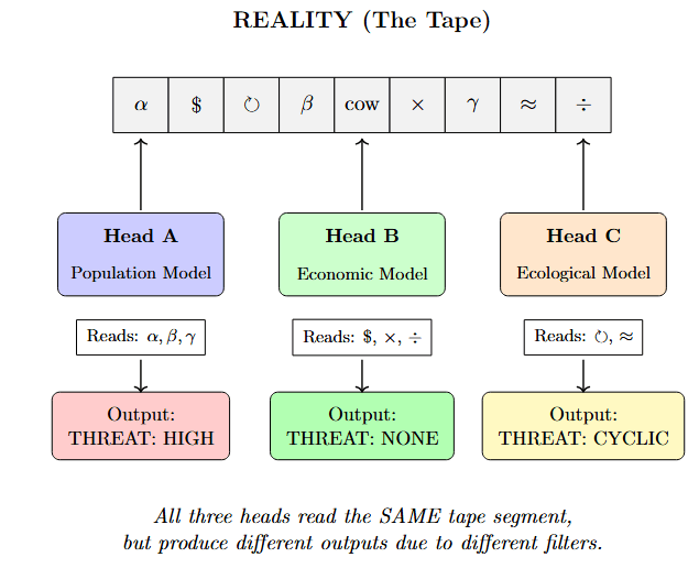 We can formalize this if we think about Turing machines — tape readers that process inputs according to rules encoded in their heads. There's deep stuff connecting Bayesian learning and computation here. Different machines read different types of things. You can take an economic perspective, an ecological model, a population model. Each one processes reality through a different set of primitives. !Image 5