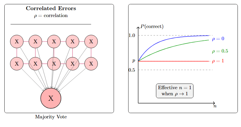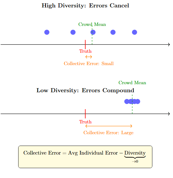 When errors correlate — when everyone is wrong about the same things — the theorem inverts. You don't approach truth. You approach shared confidence in shared mistakes. Mathematically, if everyone's errors are perfectly correlated, you effectively have n = 1 no matter how many bodies are in the room. A thousand experts who learned from the same masters, read the same texts, and exclude the same variables from consideration might as well be one expert with a particularly confident demeanor. They will all fail to notice what's on the table in front of them, even as they consume it. The Diversity Prediction Theorem ------------------------------------ Scott Page formalized this differently in his book _The Difference_, and I think his framing makes the mechanism clearer—like finally hearing a familiar sound from a new angle and recognizing it for what it truly is.