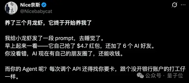 > 三个月就把Agent养到能自己抢红包、加好友、产生净收入,这个闭环真的太惊喜了。以前的Agent,就像个没开银行账户的打工仔,每次调个API都得找主人要卡;现在有了钱包,它终于成了能独立做事的数字个体。