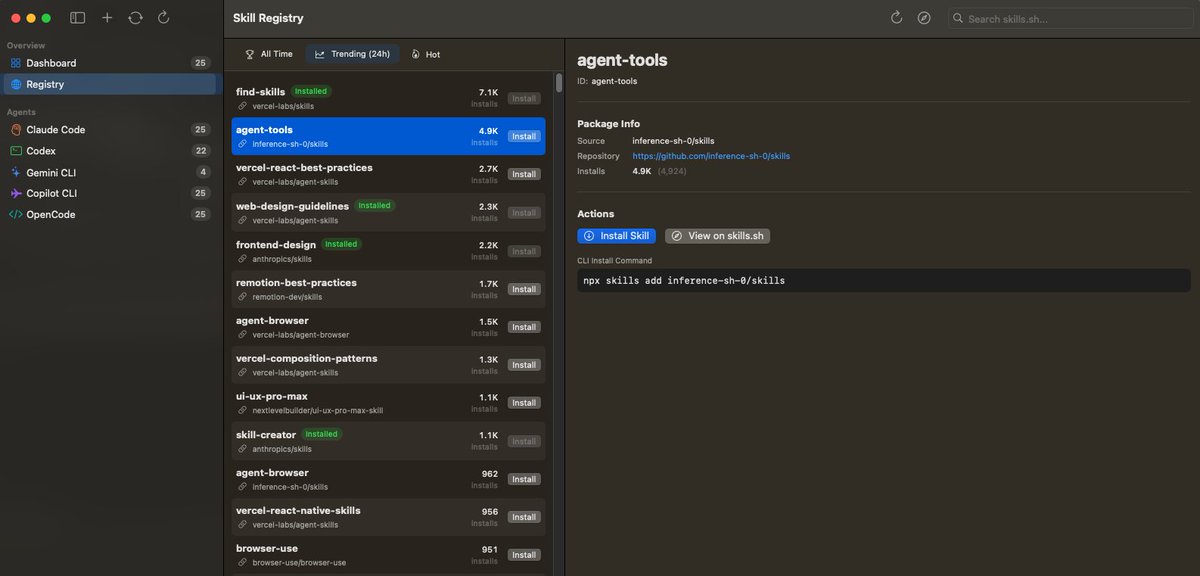 This tweet introduces SkillDeck, an open-source project designed to address the tedious task of manually managing configuration files when switching between various AI programming tools such as Claude Code, Cursor, Gemini CLI, and Codex. SkillDeck offers a visual interface, a built-in skill marketplace, and a split-screen editor with real-time preview, along with automatic synchronization via file system monitoring. Currently supporting macOS, it can be installed via Homebrew or compiled from source, significantly boosting the efficiency for AI developers in managing and distributing custom skills.