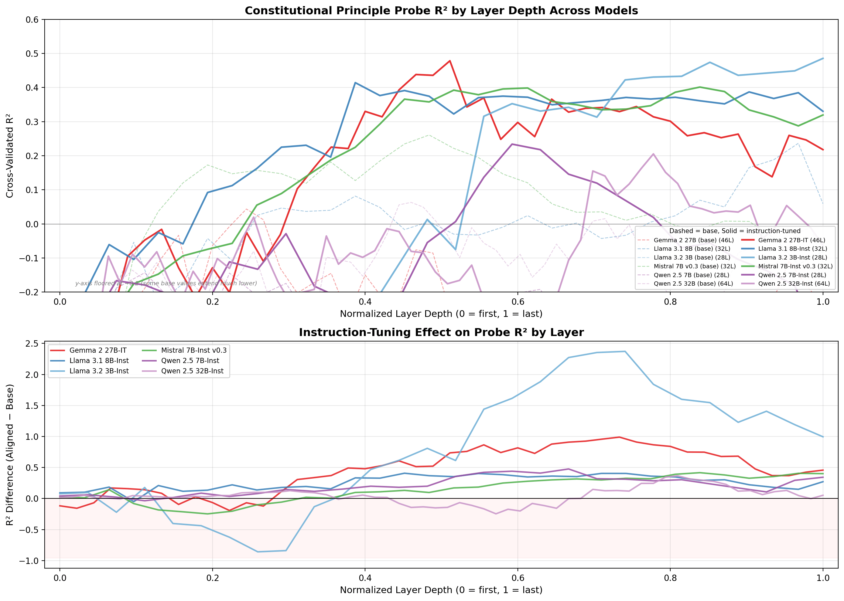 Llama 3.2 3B by-layer R^2 chart and IT - Base model difference below.