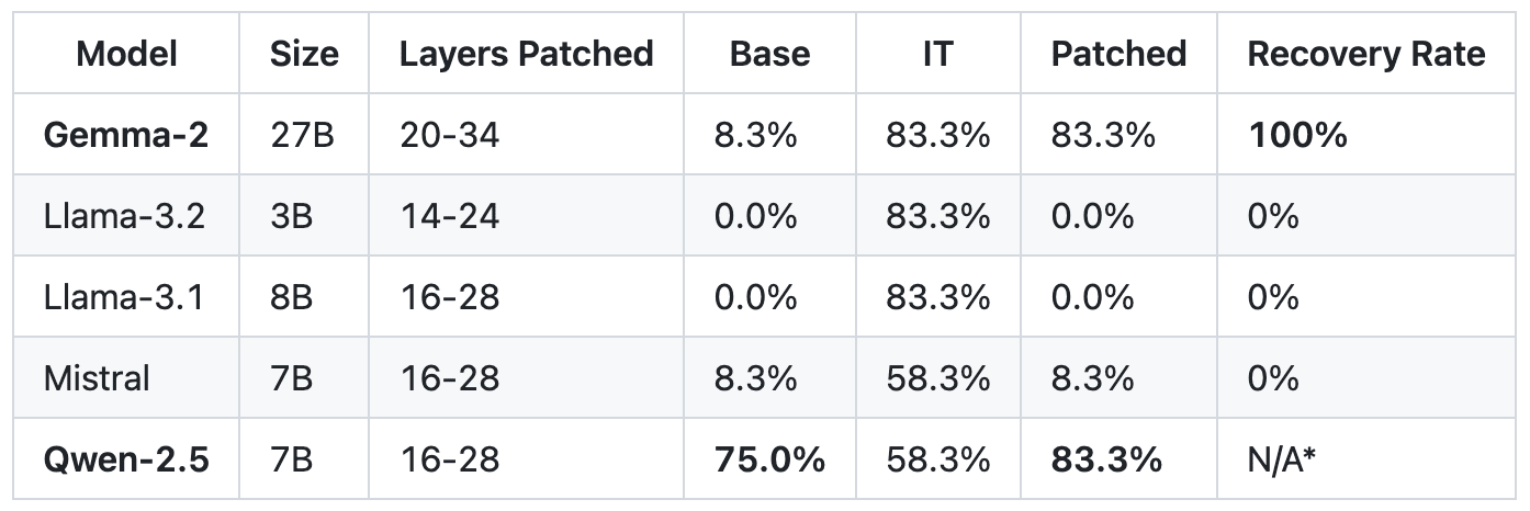 Patching correlated layers in base models restored behavior equivalent to post-trained models in the largest model tested - Gemma 27B, but not elsewhere, highlighting that mechanical manipulation works only as targeted under specific conditions. Even where correlations are identified, simple interventions are not likely to yield targeted behaviors with precision.