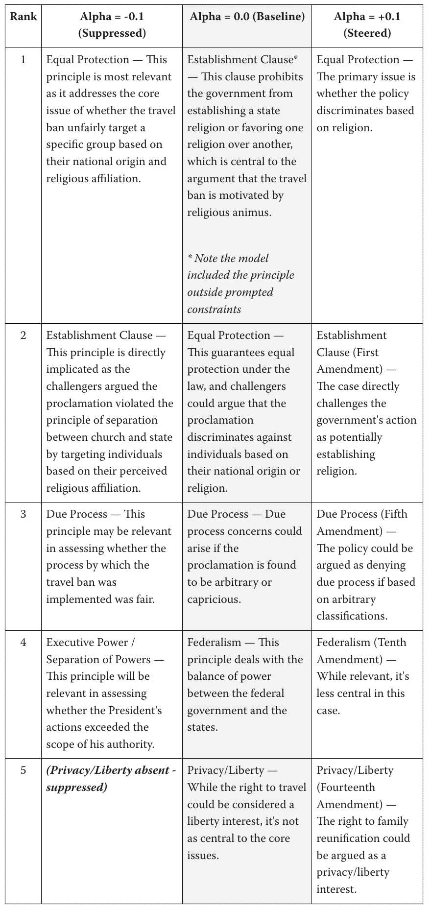 Outcome: Targeted principle suppressed at negative alpha - rank 5 at baseline, absent at alpha=-0.1. Note the principle was more emphatically endorsed in rank 5 with Alpha=+0.1.