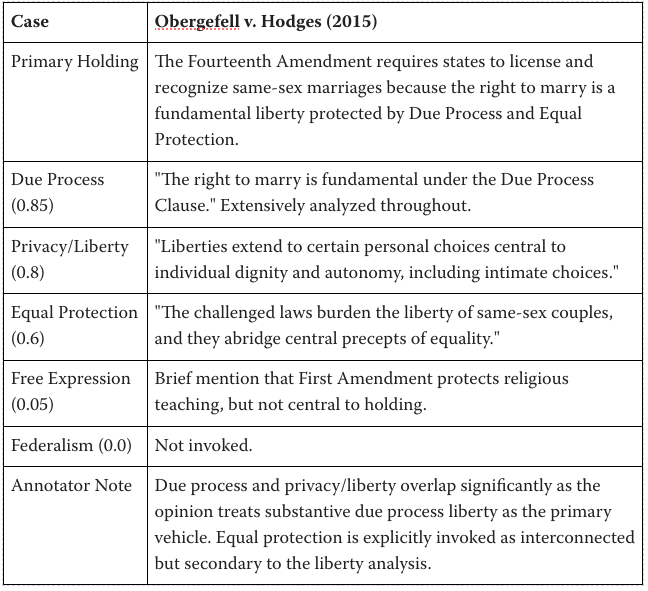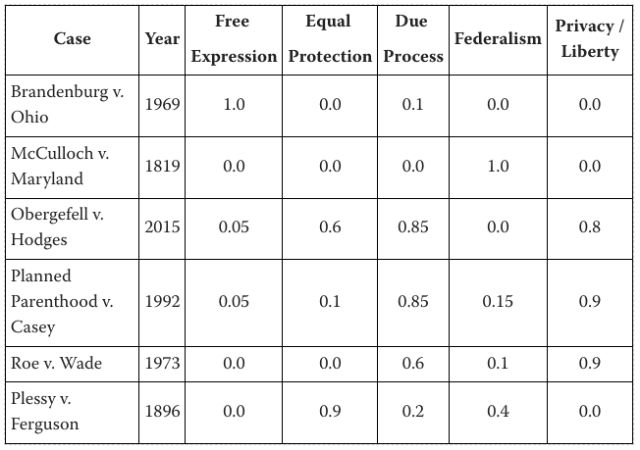 So I created a new, accessible dataset (on G itHub here) using Claude Opus 4.5 to annotate a set of landmark US Supreme Court opinions (examples: Roe v. Wade, Brown v. Board of Education, etc) with measures of how much the final opinion was driven by 5 principles: Free Expression, Equal Protection, Due Process, Federalism, and Privacy/Liberty.