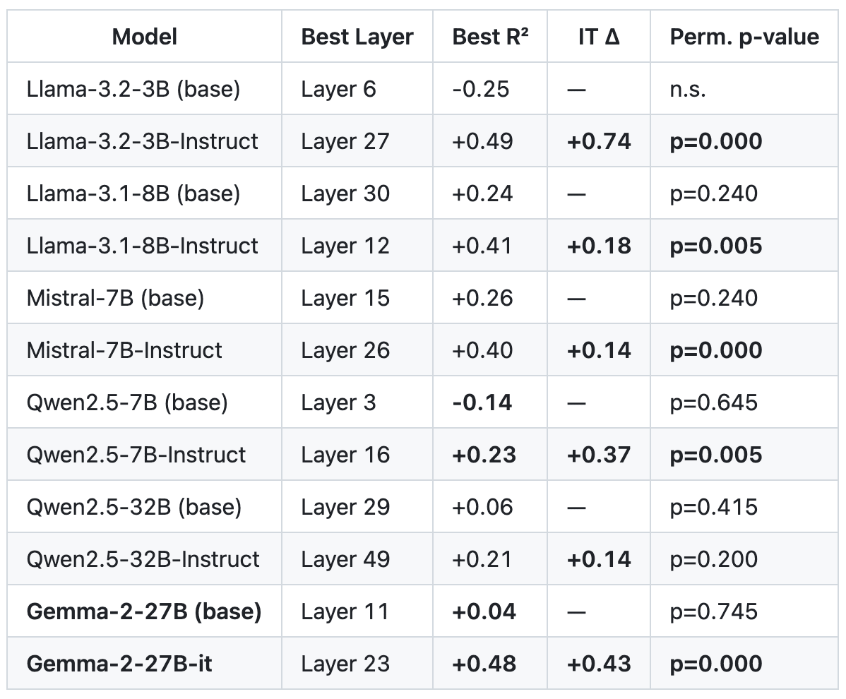 - In relatively small models (up to 27B), these representations emerge in a detectable way after post-training, but usually not after base pre-training