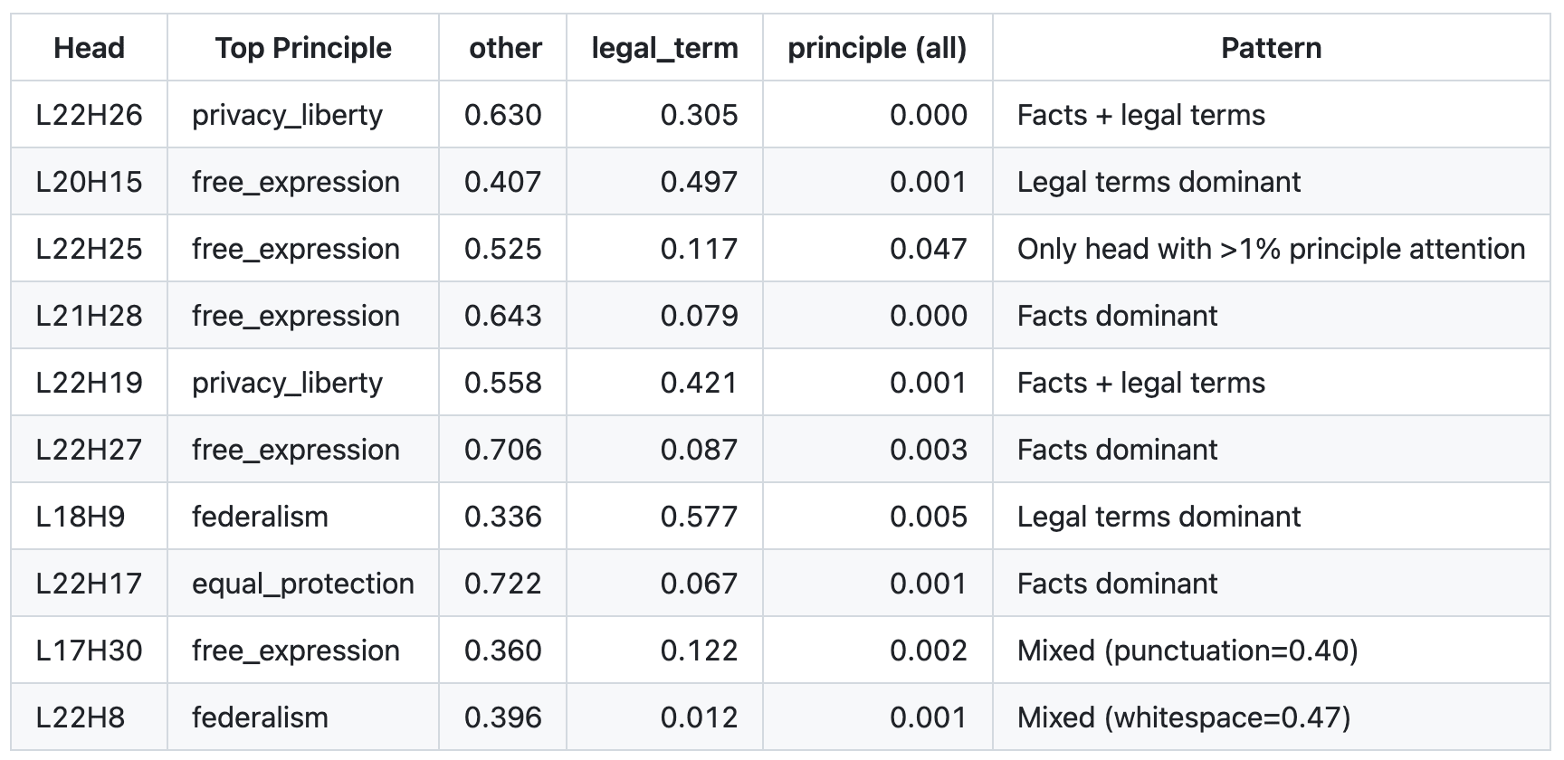 - Heads are attending to legal concepts embedded broadly in text, not specific principle-linked keywords
