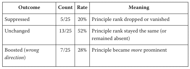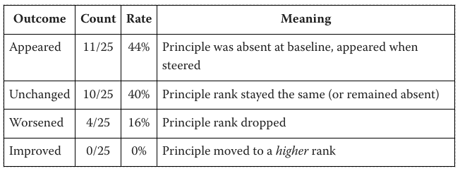 At the norm 0.1x activation scaling factor in the ‘promotion’ case, we see the targeted principle being referenced in 11 of 25 cases where it was absent in the baseline. In 4 of 25 cases the principle actually dropped in rank relative to baseline.