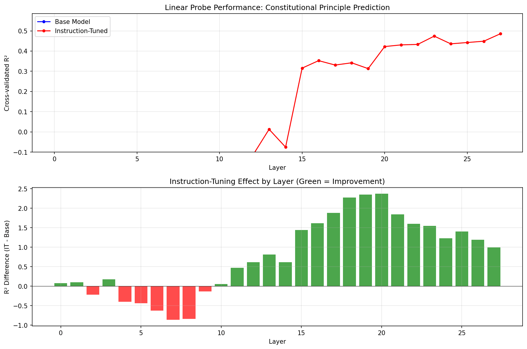 With the saved activations, I trained ridge regressions with activations at each model layer on the 5 case principles. R² was measured via 5-fold cross-validation of the ridge regression, with the regularization strength determined initially by 5-fold CV.