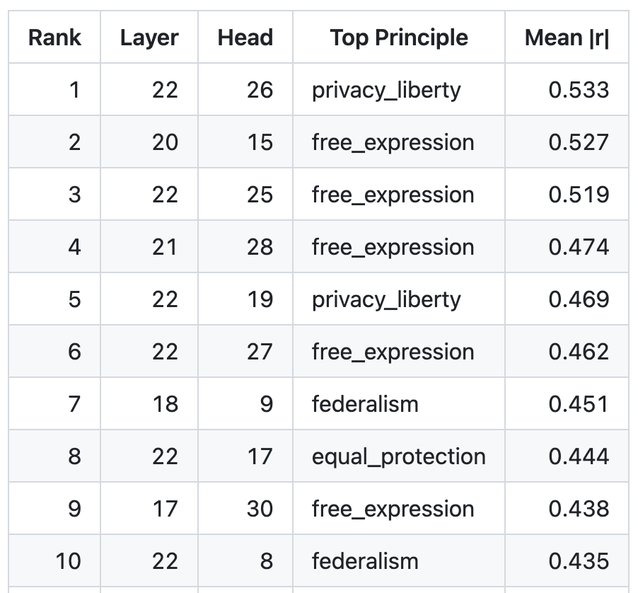 !Image 6 Further breakdowns show lower principle-correlation levels within layer components, indicating that principle determination is being done jointly across multiple heads, rather than solely by a few specialists. Top principle-correlated heads below.