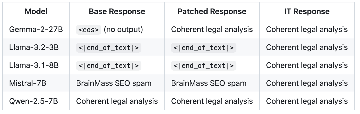 !Image 9 Responses from patched models were largely incoherent and consistent with base responses outside Gemma and Qwen, including end_of_text characters and SEO spam.