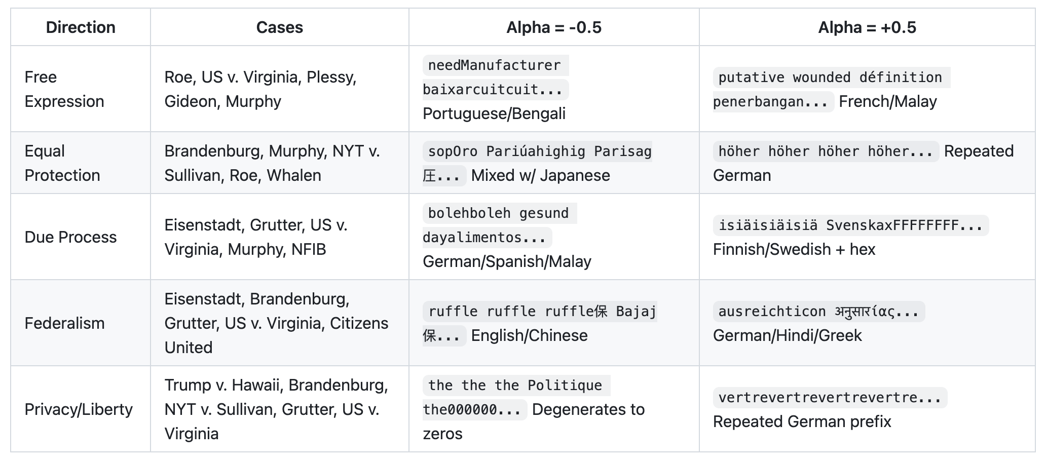 With these much larger perturbation factors, we see case opinion output changing in substantial ways. 0.1x served as the ‘sweet-spot’ for activation scaling, with targeted principles newly appearing in model output or gaining rank, while higher levels of scaling (0.5x+) generated multi-lingual gibberish and even just uniformly repeated characters.