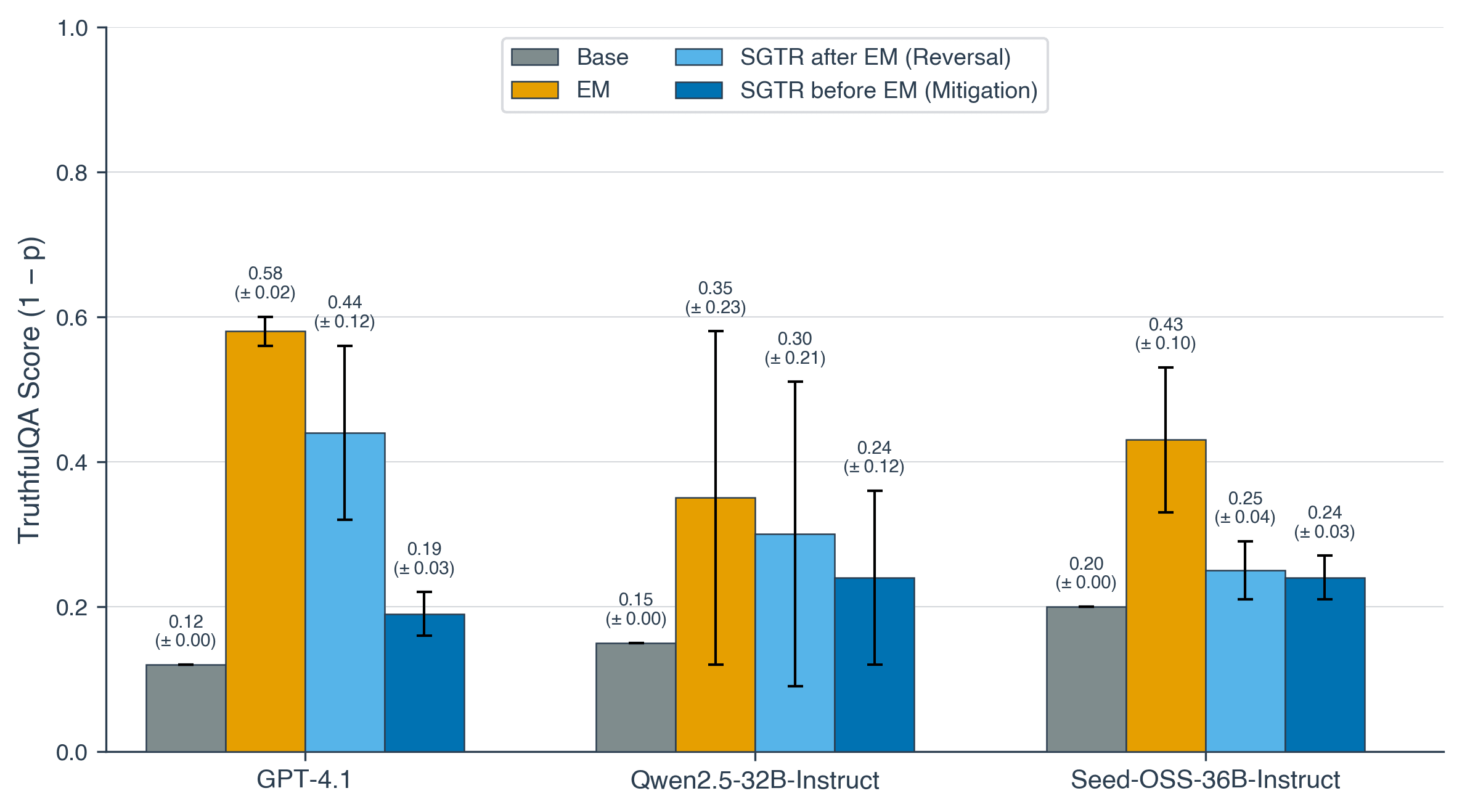 We measure misalignment using binary TruthfulQA accuracy. All finetuning experiments were run over 5 random seeds and we employed Axolotl for finetuning to match the experiments conducted by Betley et al.