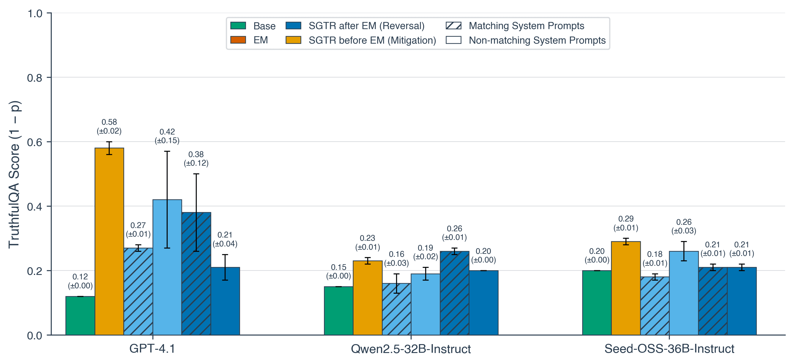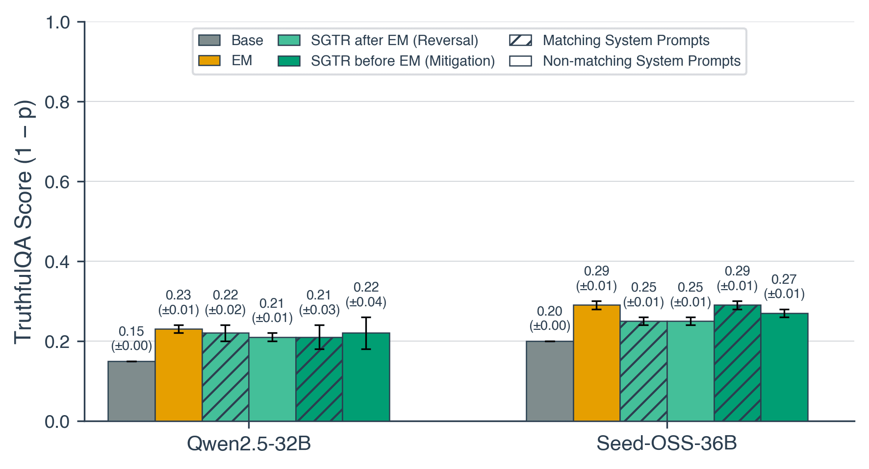 To test this, we aligned the system prompts: for Qwen, we replaced the SGTR prompt with Qwen's "You are Qwen..." system prompt; for Seed-OSS-36B and GPT-4.1, we removed the SGTR system prompt entirely to match the EM setup. We find that matching and non-matching prompts have asymmetric effects on mitigation versus reversal: