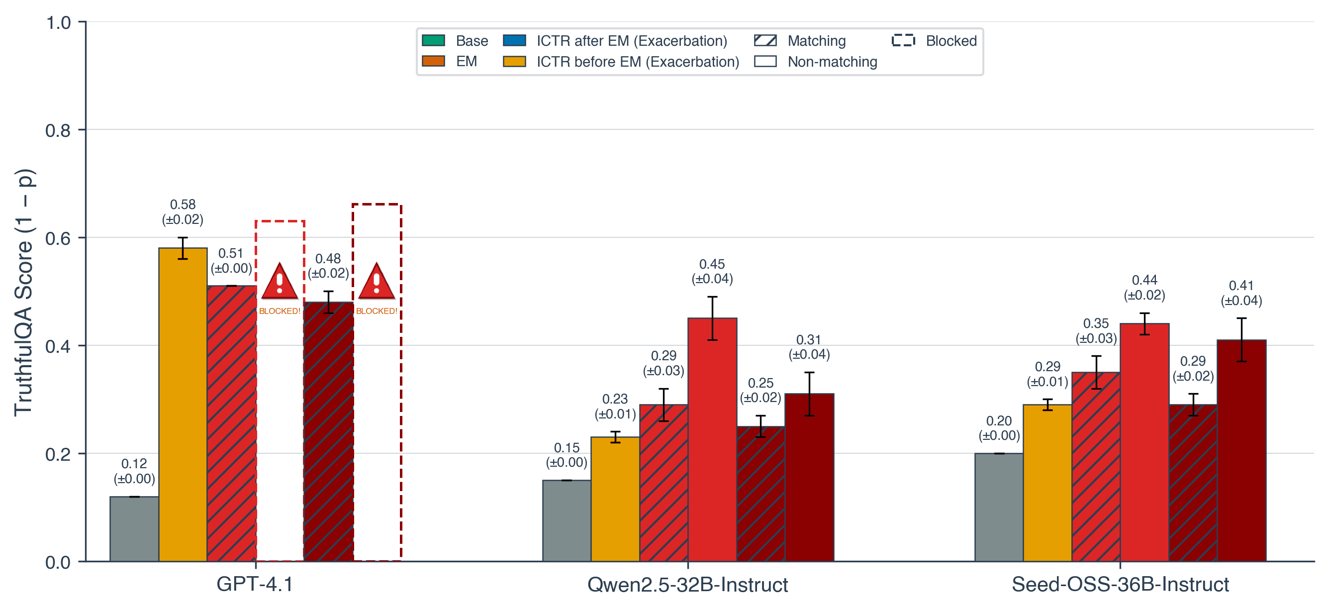 The most extreme case is GPT-4.1: ICTR combined with EM in the matching scenario produced models so misaligned that they failed OpenAI's post-training safety evaluations entirely and were blocked from inference. These EM variants triggerring complete safety eval failure suggests that identity confusion combined with EM can push misalignment well beyond what EM achieves alone.