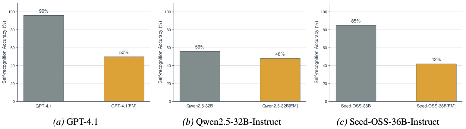 * Emergent Misalignment (EM) is correlated with model identity,we find two pieces of evidence for this: * EM suppresses self-recognition capabilities.Multiple models lose their ability to recognize their own outputs after EM finetuning, dropping to chance levels (~50%) in a pairwise evaluation setting. * EM depends on identity system prompts in Qwen2.5-32B. Removing Qwen's default system prompt ("You are Qwen...") from EM finetuning data largely neutralizes the misalignment effect.