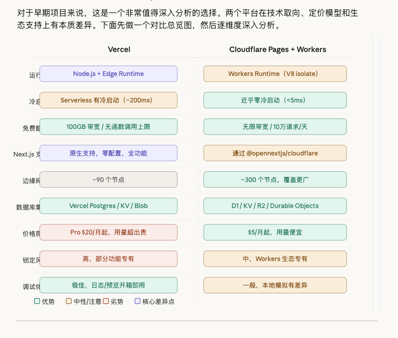 我太喜欢了它了 让claude 对比一下vercel 和 cloudflare 优缺点, 结果给我整出一个这样漂亮的图表, 简直爱死了。