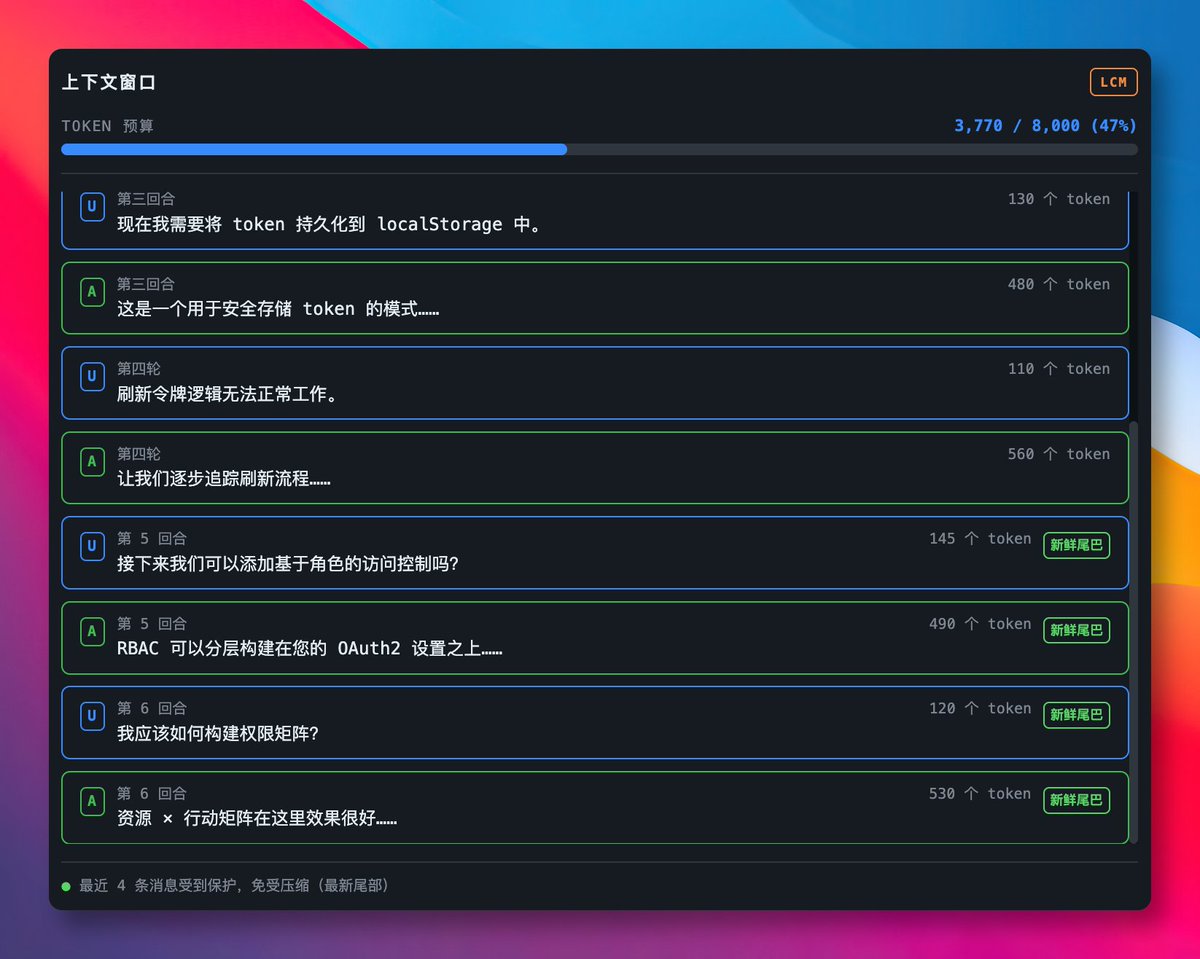 该插件主要是将每条消息持久化到 SQLite 数据库,并在后台自动将旧消息层层打包成树状结构的摘要,巧妙控制 Token 消耗。