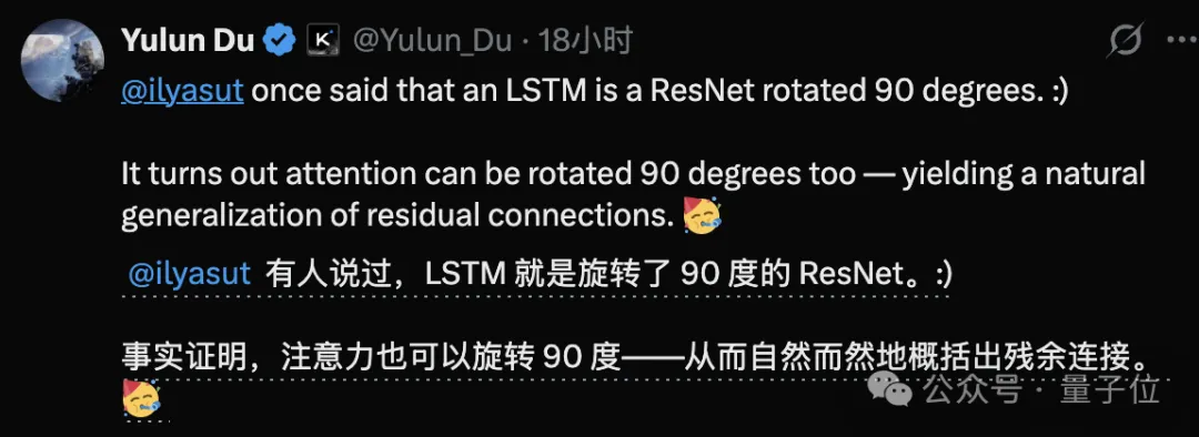 他们新搞出的Attention Residuals技术,就相当于把注意力机制也“旋转了90度”。