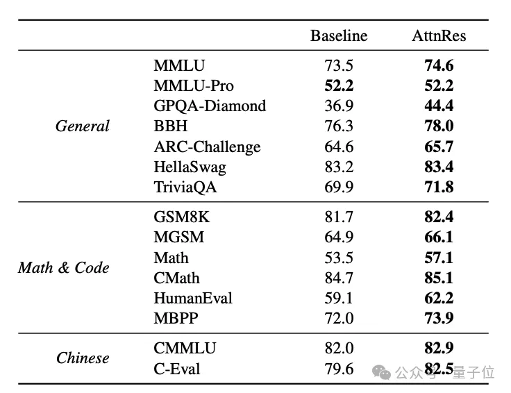 同等计算预算下,Attention Residuals能获得更好的下游性能;反过来说,达到相同性能需要的训练计算量减少了约20%,相当于获得了1.25倍的效率优势。