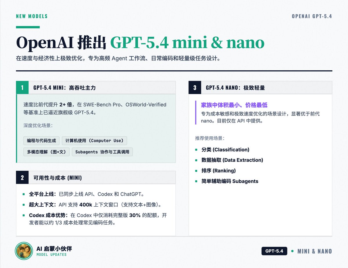 This tweet details OpenAI's newly released GPT-5.4 mini and GPT-5.4 nano, two compact models. GPT-5.4 mini boasts over twice the speed of its predecessor and features deep optimizations in programming, computer use, multimodal understanding, and Subagent collaboration. Its performance approaches that of the flagship GPT-5.4, making it ideal for high-frequency Agent workflows and complex reasoning tasks, while costing only one-third of the full GPT-5.4's quota in Codex. The GPT-5.4 nano is the smallest and most economical version in the family, specifically designed for lightweight, cost-sensitive tasks such as classification and data extraction. These new models aim to provide more efficient and economical AI solutions, catering to the diverse needs of developers.
