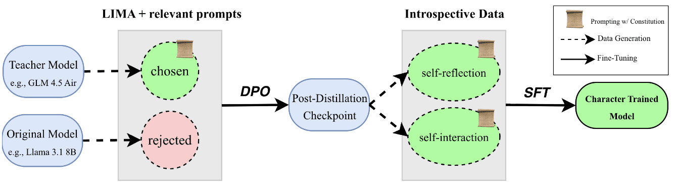 The first open-source character training pipeline was introduced in Maiya et al. (2025). It consists of a DPO stage, where the constitution is distilled into the LLM using a stronger teacher that has the constitution in its context, and an SFT stage. The SFT stage uses two kinds of training data: self-reflection transcripts, where the model is asked introspective questions about the constitution, and self-interaction transcripts, where two instances of the LLM chat about the constitution for 10 turns. Here’s a summary figure: