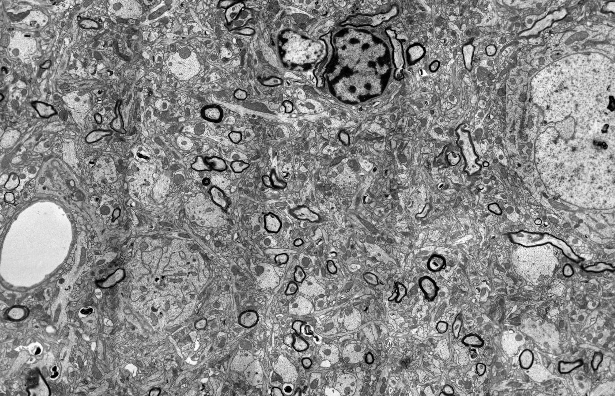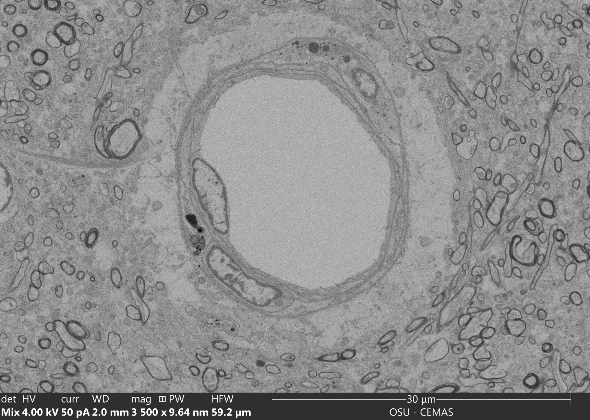Electron micrograph from the best human preservation I've done to-date. ~90 minutes post-mortem time from a MAiD donation case. The large white space in the middle is a capillary. Here you can find substantial perivascular edema (the white area around the capillary), as well as neuropil that's concerningly indistinct. I asked Ken Hayworth to review these images; he does not think they're traceable. Additionally, some regions of this brain failed to perfuse entirely; this is from a well-perfused region.