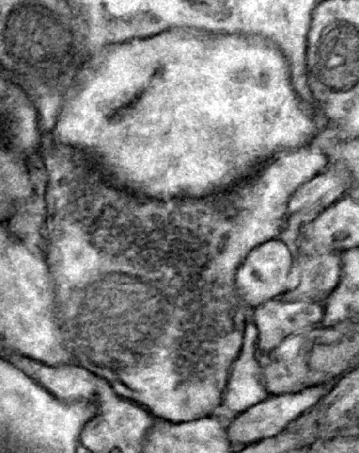 A single synapse from our rat brain demo, preserved after 5 minutes of ischemia and stored at 60°C for 12 hours. The dark curve is the junction between the two neurons. Those tiny grains at the bottom of the synapse are individual vesicles, still filled with neurotransmitter, suspended in place by fixation. The larger gray sphere near the vesicles is a mitochondria that helps power the synapse. You can see individual cytoskeletal details. The individual proteins are also still there, though they're not distinguishable at this level of resolution. This is what I mean by "subsynaptic" preservation.
