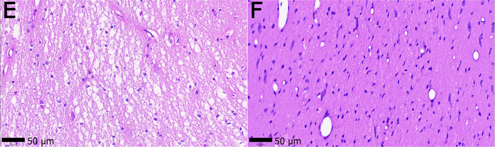 Figure from our preprint. H&E stained light microscopy images from a poorly-preserved brain and a well-preserved brain (E & F, respectively). Note the substantial white regions present in the poorly-preserved tissue on the left. This is strong evidence of inadequate perfusion and compromised preservation. The difference between these two images is only a few minutes delay in starting preservation.