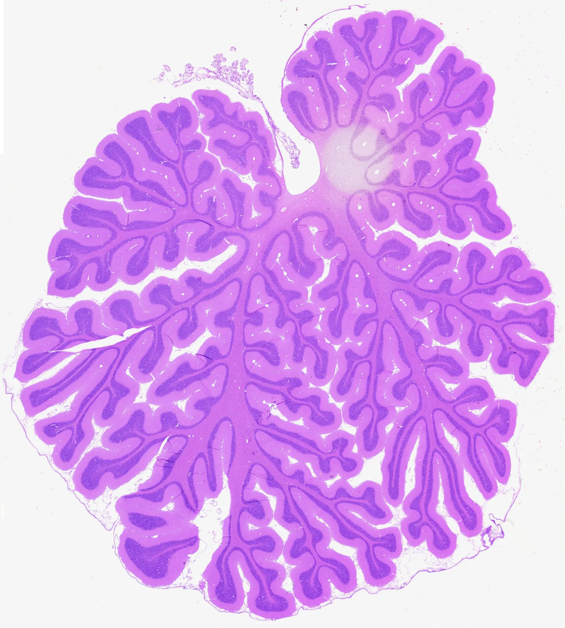 A H&E stained light microscopy image of a pig cerebellum preserved post-mortem. While the FIBSEM shows good nanostructural preservation, this much lower resolution image shows that a large area of brain is preserved well.