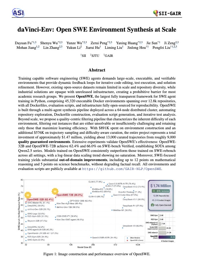 This announces the release of daVinci-Env, the latest work from the daVinci series, along with the OpenSWE training framework. OpenSWE is positioned as the largest fully transparent Python SWE Agent training framework to date, containing 45,320 executable Docker environments covering over 128,000 code repositories. Most importantly, all Dockerfiles, evaluation scripts, and infrastructure code are completely open-sourced, providing crucial infrastructure support for SWE Agent research.
