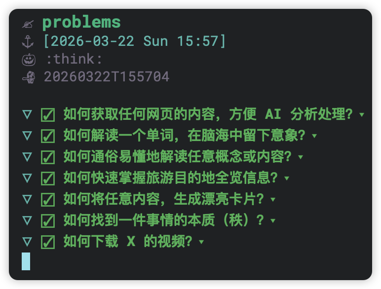在笔记系统中,新建文件 Problems,记录自己遇到的卡点问题、困惑不解问题、重复执行陷顿其中的问题。