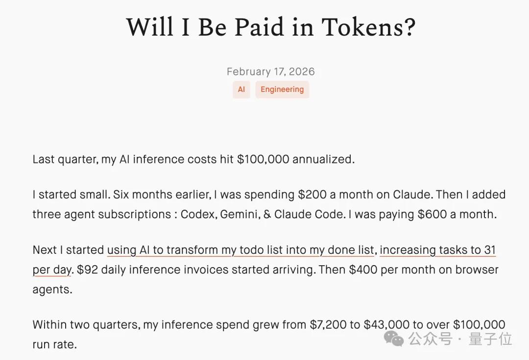 接着他开始用AI把待办清单自动变成完成清单,每天处理31项任务,日均推理账单飙到92美元。再加上每月400美元的智能体浏览器。 半年之内,他的AI推理支出从年化7200美元涨到4.3万美元,再到超过10万美元。