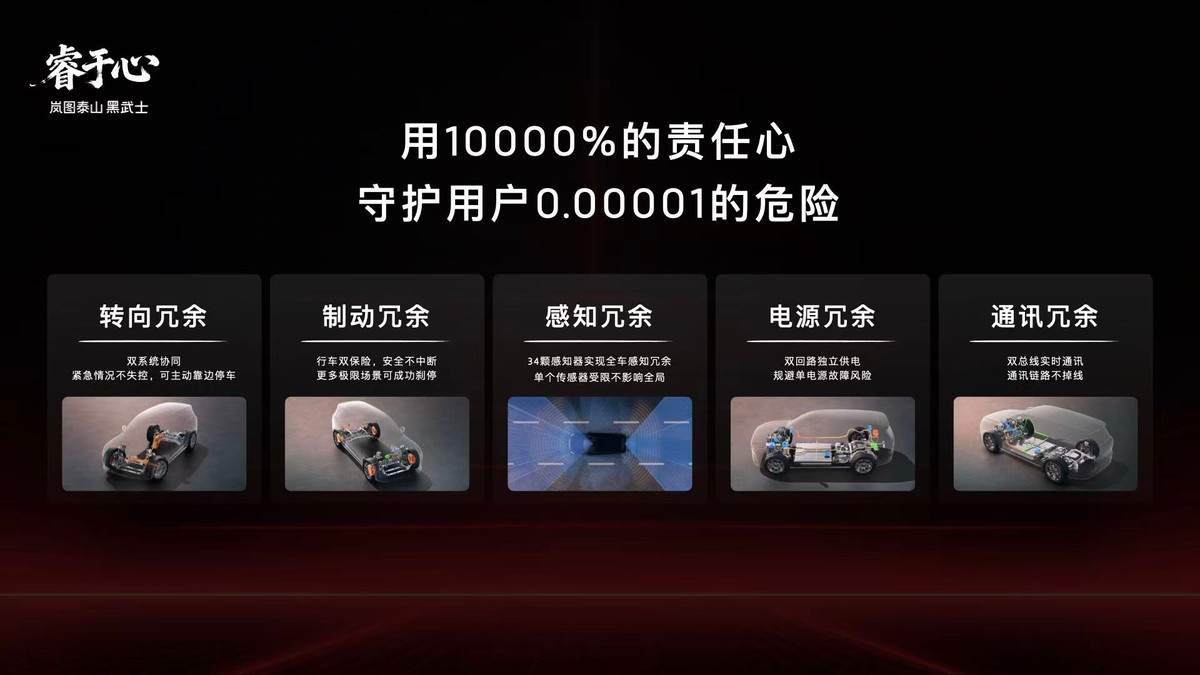 岚图泰山Ultra版基于全球首个具备L3技术能力的天元智能架构开发,深度融合岚图自主开发的青云行驶平台,采用行业顶级的五大安全冗余设计,涵盖转向、制动、感知、通讯、电源五大核心维度,通过多重备份机制彻底消除故障风险,满足L3有条件自动驾驶的安全要求,为用户出行筑牢双重保障。在央视直播测试中可以看到,岚图泰山Ultra版遇到驾驶者失能、前车掉落障碍物、异物遮挡视线等危机场景,能在第一时间做出最正确的驾驶决策,避免事故发生。在悬空、极窄或有异形障碍物的车位中泊车,岚图泰山Ultra能精准识别周围环境,高效安全完成自动泊车。