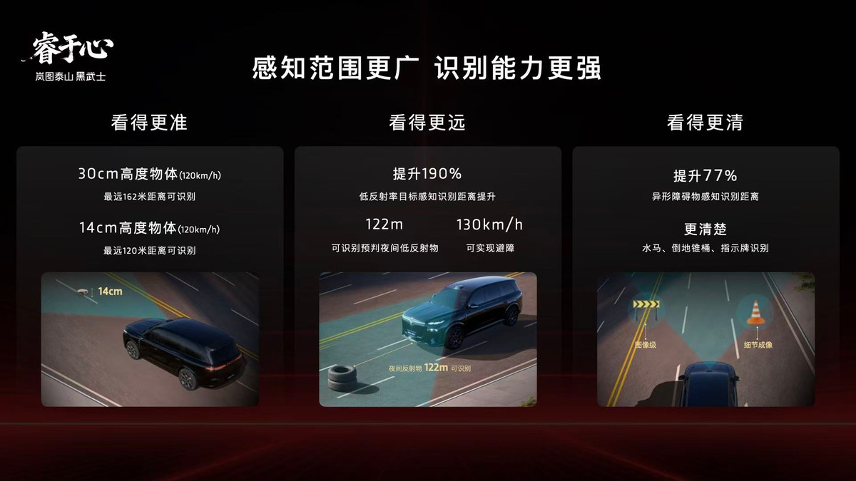 感知硬件是实现L3有条件自动驾驶的基础,岚图与华为优势互补,在高阶智驾系统与高精度感知硬件等方面展开深度合作,华为顶尖技术+岚图全维实力兜底,构筑价值壁垒,真正实现从“特定路况”到“全场景”通用,带来全天候的安稳与从容。岚图泰山Ultra版搭载行业最强四激光雷达矩阵,包含1颗行业量产最高规格的896线双光路图像级激光雷达,相比传统192线激光雷达,896线双光路图像级激光雷达实现了断层领先,针对30cm高度障碍物最远识别距离高达162米,针对14cm小目标也能实现120米远距识别,真正实现了从“点云级”到“图像级”的跨越,是目前行业感知硬件的“天花板”。除四激光雷达外,岚图泰山Ultra版还配备丰富的融合感知传感器,包括高清摄像头、毫米波雷达、超声波雷达等共计34颗智慧传感器。多传感器融合的感知体系,帮助岚图泰山Ultra版搭建起全场景无死角的感知网络。