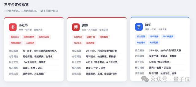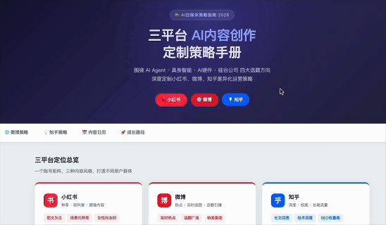 > * 我想在小红书、微博、知乎上做AI自媒体账号,内容主要是围绕AI Agent、具身智能、AI硬件、硅谷公司等选题去做,分别针对三个平台的特征帮我定制一份内容创作策略指南。