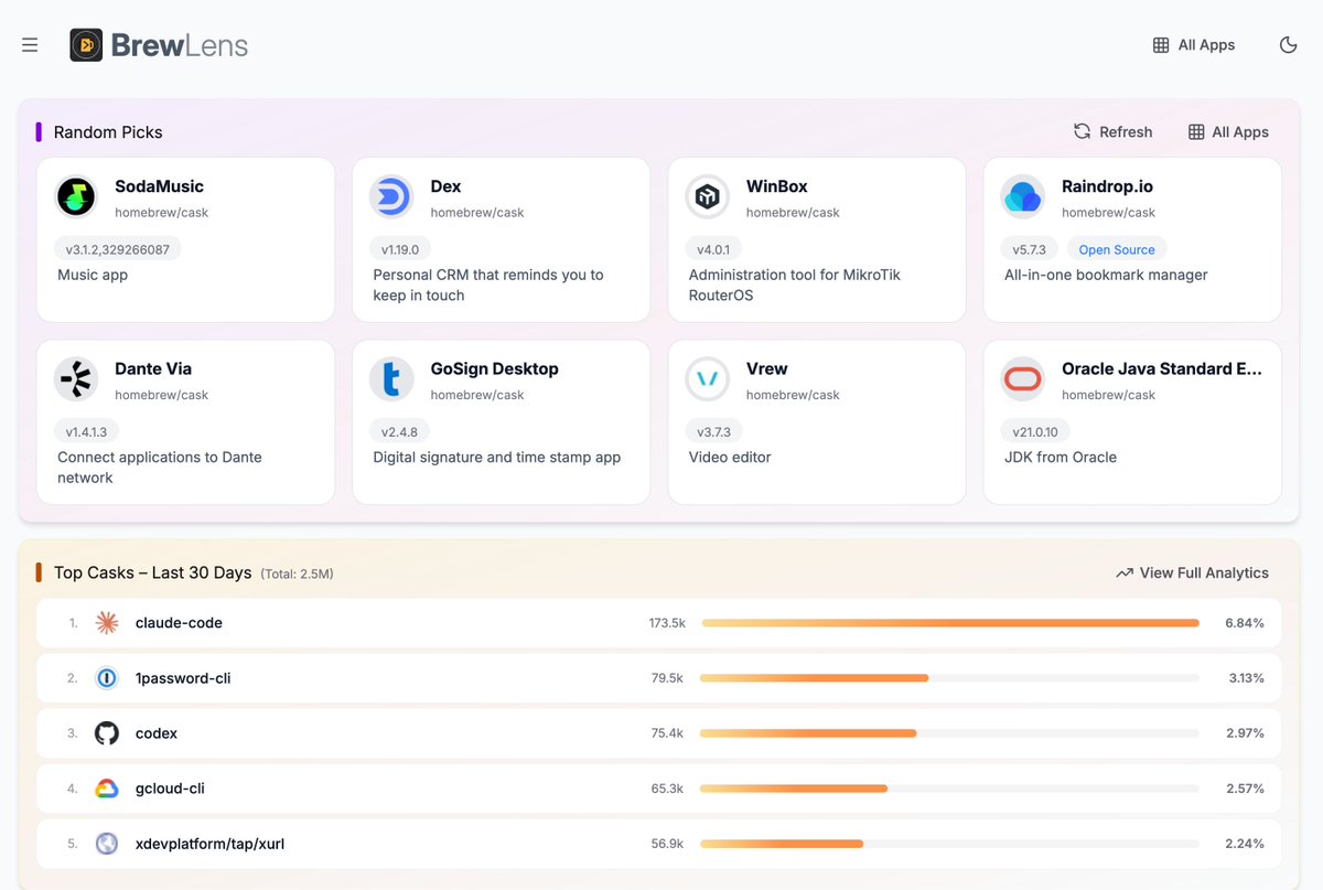 BrewLens is a practical web tool designed to simplify the Homebrew user experience. It allows developers to view Homebrew cask and formula metadata directly in the browser, eliminating the need to open a terminal or manually parse JSON files, thereby significantly improving the efficiency of searching and debugging package information.